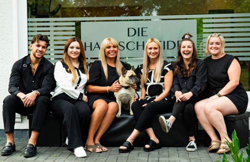 Geschäftsübergabe geglückt: Karl-Heinz Gotzmann übergibt seinen Salon in Ummeln an Nadja El-Dahshan (links). Das freut auch Mitarbeiterin Cindy Brychtova (von rechts), Tochter Vivian Gotzmann und Mitarbeiterin Olivia Karasinski mit Salonhund Louis.
